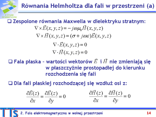 Na podstawie wyprowadzonych równań Helmholtza, wspomagając się równaniami Maxwella, znajdziemy matematyczny opis fali płaskiej rozchodzącej się w nieograniczonej przestrzeni, określimy jej własności i parametry. | |||