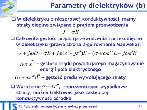 Celem wykładu jest przedstawienie matematycznego opisu, własności i parametrów fali płaskiej rozchodzącej się w przestrzeni nieograniczonej wypełnionej stratnym dielektrykiem. | |||