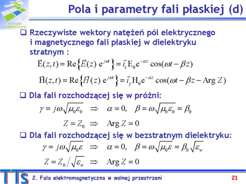 Propagacja fali płaskiej w bezstratnej wolnej przestrzeni jest przypadkiem szczególnym, a jej własności wynikają z rozwiązania dla przypadku bardzej ogólnego, z uwzglenieniem strat ośrodka. | |||