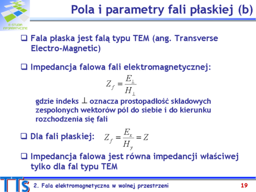 - Właściwości fali płaskiej - fala płaska jest falą typu TEM (Transverse Electro-Magnetic)