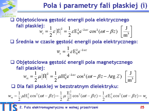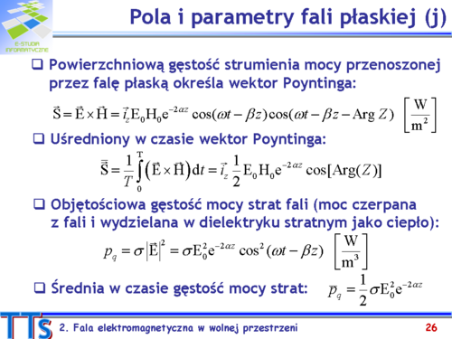Przedmiotem wykładu jest monochromatyczna fala elektromagnetyczna, czyli fala o ustalonej częstotliwości harmonicznych (cosinusoidalnych) zmian pól w czasie. W zagadnieniach dotyczących takich pól stosujemy rachunek symboliczny wykorzystujący operacje na funkcjach zespolonych w dziedzinie częstotliwości. | |||