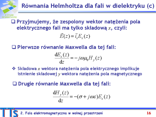 Z równań Maxwella w postaci zespolonej wyprowadzimy równania Helmholtza (odpowiednik równania falowego) dla pola elektrycznego i magnetycznego fali płaskiej rozchodzącej się w nieograniczonym ośrodku dielektrycznym. | |||