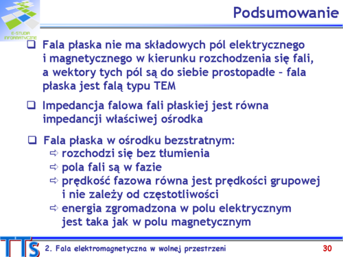 - Wektory i fali TEM leżą w płaszczyźnie prostopadłej do kierunku propagacji i są prostopadłe względem siebie.