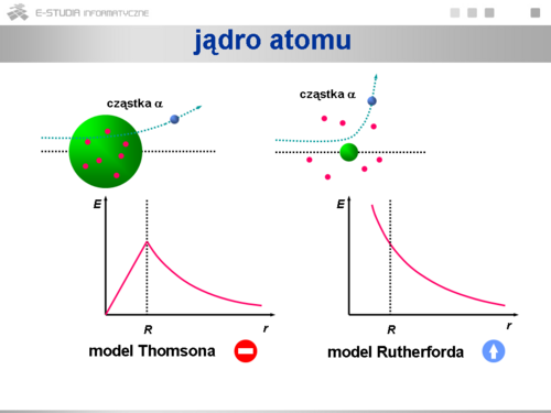 |valign="top"| | |valign="top"|W przypadku jednorodnego rozkładu ładunku wewnątrz atomu (model Thomsona) potencjał elektrostatyczny maleje wewnątrz atomu. Oznacza to stosunkowo słabe oddziaływanie, któremu podlega cząstka alfa wewnątrz atomu i w rezultacie należy oczekiwać rozproszeń na małe kąty. Natomiast w doświadczeniu Rutherforda obserwuje się również rozproszenia na duże kąty a nawet rozproszenia do tyłu. Zgodnie z obliczeniami (tzw. wzór Rutherforda) jest to możliwe tylko wtedy jeśli założyć istnienie małego i masywnego jądra. Wówczas potencjał elektrostatyczny rośnie wewnątrz atomu i cząstka alfa może wręcz odbić się od jądra. Porównanie wzoru Rutherforda z doświadczalnym rozkładem kątów rozproszenia cząstek alfa wyznacza rozmiar jądra. Okazuje się, że jądro jest bardzo małe, promień jego to zaledwie kilka femtometrów. | ||