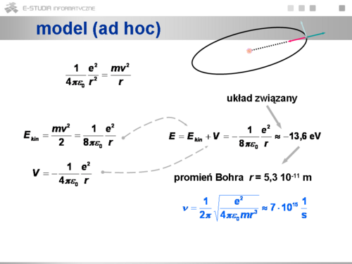 |valign="top"| | |valign="top"|Jeżeli przyrównamy siłę Coulomba, która działa na elektron ze strony jądra do siły odśrodkowej, skierowanej przeciwnie, to można wyznaczyć prędkość z którą musi krążyć elektron aby siły te równoważyły się (model planetarny). Wyznaczmy stąd energię kinetyczną elektronu poruszającego się po orbicie stacjonarnej, czyli takiej że elektron nie przemieszcza się w kierunku jądra. Określmy również całkowitą energię elektronu dodając energię potencjalną oddziaływania elektrostatycznego. Zwróćmy uwagę, że energia potencjalna unormowana jest tak, że zeruje się w nieskończoności. Jest więc ujemna co odpowiada temu, że atom jest układem związanym. Trzeba dostarczyć mu energii aby rozdzielić trwale elektron od jądra (taki proces zwiemy jonizacją). Traktujemy zjonizowany atom jako posiadający zerową energię potencjalną. Doświadczalnie stwierdzono, że energia wiązania atomu wodoru wynosi 13,6 eV. Podstawiając tę zmierzoną wartość można wyznaczyć promień kołowej orbity elektronu, tzw. promień Bohra. Jego wartość wynosi | ||