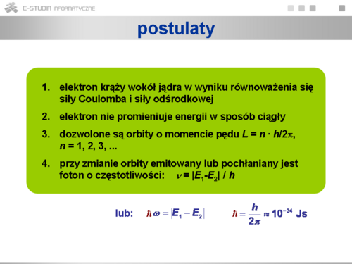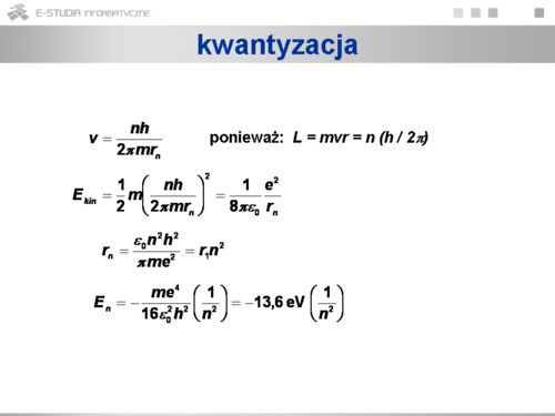 Jest to warunek arbitralny. Jednakże tylko taki postulat gwarantuje zgodność z danymi doświadczalnymi. Oczywiście narzucenie warunku kwantowego na moment pędu implikuje podobne warunki na inne wielkości kinematyczne opisujące ruch elektronu. Skwantowana jest całkowita energia elektronu: | |||