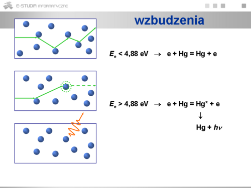 |valign="top"| | |valign="top"|Wiązka elektronów porusza się z określoną energią kinetyczna w parze rtęci. Energia elektronów określana jest przez napięcie przyspieszające w lampie. Dopóki energia kinetyczna elektronów jest mniejsza niż 4,88 eV to zderzenia elektronów z atomami rtęci są elastyczne. Oznacza to, że nie zmienia się stan wewnętrzny atomu. Elektron będzie doznawał wielu zderzeń poruszając się po łamanej aż dotrze do anody. Część jego energii przekazana będzie wielu napotkanym atomom rtęci. Jeżeli jednak energia kinetyczna elektronu jest większa niż wspomniane 4,88 eV to może zajść zderzenie nieelastyczne, w którym elektron traci energię 4,88 eV a atom pochłaniając tę energię przechodzi do stanu wzbudzonego. Utrata określonej energii przez elektrony w wyniku wzbudzenia atomów rtęci skutkuję pojawieniem się pierwszego minimum w zależności I(U). Wzbudzony atom rtęci powraca natychmiast (10-8 s) do stanu podstawowego emitując foton o energii <math>h\nu = 4,88 eV</math> czyli o długości fali | ||