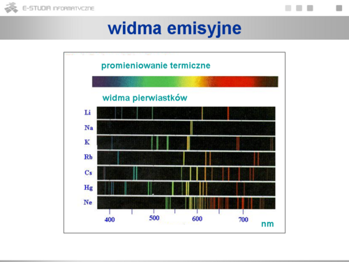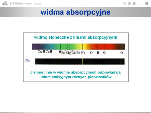 |valign="top"| | |valign="top"|Jeżeli promieniowanie o widmie ciągłym (np. promieniowanie termiczne) przechodzi przez ośrodek to pojawiają się w nim ciemne prążki. Ośrodek zbudowany jest z atomów, które znajdują się w swoich stanach podstawowych, i z których każdy charakteryzuje odpowiednimi poziomami wzbudzonymi. W promieniowaniu o widmie ciągłym znajdują się fotony o wszystkich wartościach energii z pewnego przedziału. Te, których energie odpowiadają różnicom energetycznym między poziomami napotkanych atomów zostają pochłonięte przez te atomy. Pojawiają się więc w widmie ciemne prążki typowe dla danego ośrodka. Oczywiście mamy do czynienia z pełną odpowiedniością ciemnych prążków w widmach absorpcyjnym i jasnych linii w widmie emisyjnym | ||