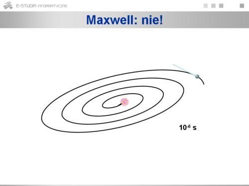 |valign="top"| | |valign="top"|Spójny obraz struktury atomu wodoru okazuje się być sprzeczny z teorią Maxwella elektromagnetyzmu. A teoria ta stanowi podstawę teoretyczną wielostronnie zweryfikowanej fizyki klasycznej. Otóż krążący wokół jądra elektron porusza się ruchem przyspieszonym (ruch po torze krzywoliniowym jest ruchem przyspieszonym). Z teorii Maxwella wynika, że taki krążący ładunek wypromieniowuje w sposób ciągły energię w postaci fali elektromagnetycznej. Tracąc energię elektron powinien poruszać się po spirali dopóki nie spadłby na jądro. Obliczenia pokazują, że czas życia takiego atomu nie przekroczyłby <math>10^{-6} s</math>. A przecież wiadomo, że atomy są trwałe. Co więcej, jeśli emitują promieniowanie elektromagnetyczne, to są to fale o dyskretnych (nieciągłych) wartościach długości fali, tzw. widmo liniowe. | ||