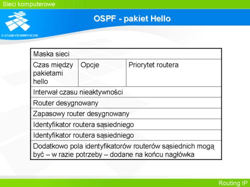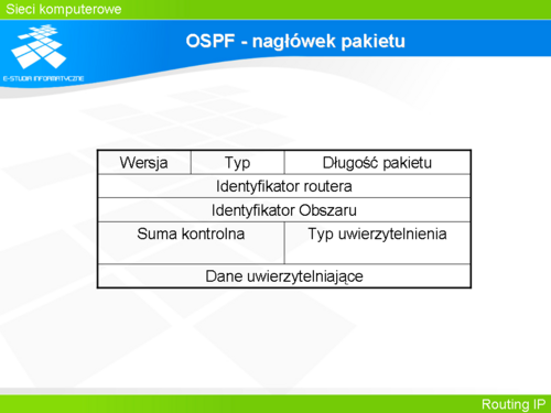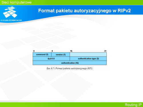 command - (1B) pole komendy version - (1B) Wersja protokołu RIP AFI (ang. address family identyfier) - (2B) pole identyfikujące jaki protokół będzie przesyłany. W przypadku IP wpisana jest tam wartość 2. Gdy pole ma ustawioną wartość 0xFFFF, to pakiet niesie informację o autoryzacji. route tag (2B) - określa czy trasa jest wysłana z lokalnego routera obsługującego protokół RIP (trasa wewnętrzna) czy też innego routera obsługującego inne protokoły (trasa zewnętrzna). IP address - (4B) jeśli w polu AFI jest wartość 2, to pole to przechowuje adres IP subnet mask - (4B) maska podsieci next hop - (4B) adres następnego routera na trasie (następnego skoku) metric - (4B) metryka Format pakietu zawierającego informację o autoryzacji zostanie pokazany na następnym slajdzie. |