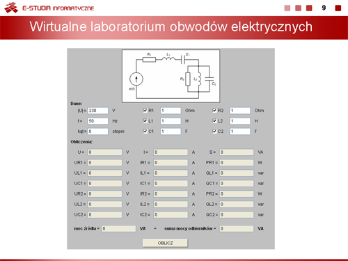 Należy wyznaczyć wartości skuteczne zespolone prądów i napięć elementów oraz moce w obwodzie.
