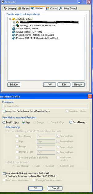Po skonfigurowaniu pośrednika i klienta poczty, należy ustawić preferencję wykorzystywania mechanizmu PGP - należy ustawić profile i przypisać do nich odpowiednie klucze. Klucze pobierane są z głównej aplikacji GnuPG. Wybór i edycja profilu pozwala określić czy poczta ma być podpisywana, czy szyfrowana, czy obie akcje równocześnie lub w ostateczności nie musimy nic z pocztą robić.