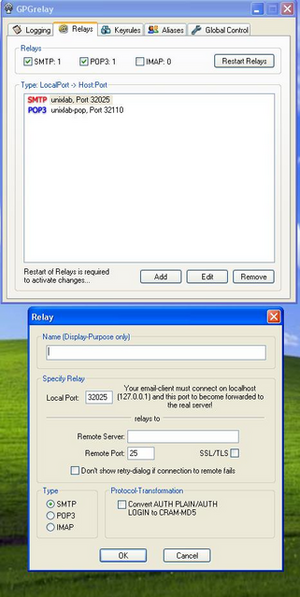 Następnie instalujemy aplikacje GnuPGRelay, którą musimy skonfigurować do wysyłania i odbierania poczty. Dokładniej należy ustawić serwery poczty przychodzącej (POP3) i wychodzącej (SMTP), aby móc korzystać z pośrednika, dodatkowo wymaga to przekonfigurowania aplikacji klienta poczty, aby kontaktował się z pośrednikiem lokalnym jako serwerem poczty przychodzącej i wychodzącej.
