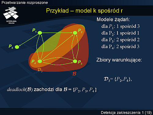 Modele żądań dla P1, P2, P3 i P4 są zdefiniowane następująco: 1 spośród 3, 1 spośród 1, 2 spośród 2, oraz 2 spośród 3. W rozważanym stanie, proces P1 może być uaktywniony, ale procesy P2, P3 i P4 są zakleszczone. Warto zauważyć, że predykat deadlock() jest predykatem stabilnym. Tym samym zajście tego predykatu w pewnej chwili τ, implikuje, że dla każdego ττ, deadlock()=True.