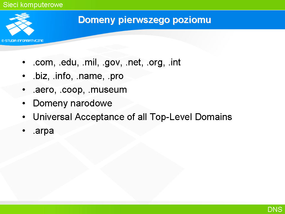 .com – firmy comercyjne, .net – firmy/organizacje zajmujące się ogólnie rozumianą technologią sieciową, .org – firmy/organizacje non-profit
