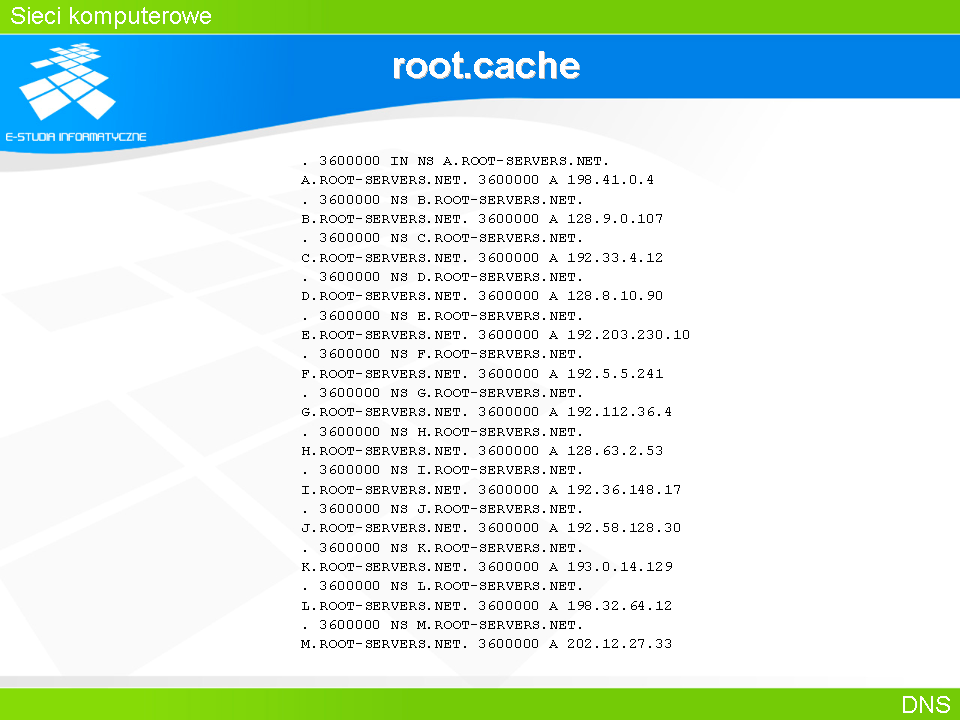 Plik zawierający bazę root serwerów składa się z dwóch typów rekordów. Jeden typ to rekordy stosowane opisu delegacji domeny: . 3600000 IN NS A.ROOT-SERVERS.NET. oraz drugi do opisu mapowania nazwy na numer IP: A.ROOT-SERVERS.NET. 3600000 A 198.41.0.4