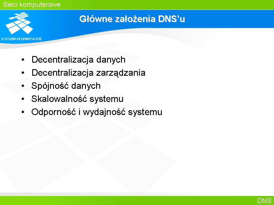 Utrzymywanie pliku HOSTS.TXT w sieci ARPAnet było stosunkowo proste i mało kłopotliwe. Administratorzy wysyłali do NIC wprowadzone przez siebie zmiany i raz na jakiś czas (np. dwa razy w tygodniu) pobierali plik HOSTS,TXT z NIC. System ten zdawał egzamin dopóki sieć składała się z kilkuset hostów. Wraz ze wzrostem liczby host’ów wzrosło obciążenie sieci i serwera związane z dystrybucją pliku. Wystąpiły problemy z utrzymaniem spójności pliku w zakresie unikalności nazw. Ponadto proces przeszukiwania dość dużego pliku przez lokalne komputery stanowił poważne źródło obciążenia. Przystępując do tworzenia nowego systemu przyjęto szereg założeń, których celem było uniknięcie wszystkich dotychczasowych ograniczeń. Najważniejszą cechą systemu nazw symbolicznych jest niewątpliwie hierarchiczna struktura danych, która pozwala zarówno na decentralizację danych, jak i na decentralizację zarządzania danymi. Zarządzanie danymi odbywa się w miejscu ich powstawania w ściśle określonym zakresie, co w naturalny sposób gwarantuje spójność systemu. W podobny, naturalny sposób osiągnięto wysoki stopień odporności i wydajności systemu wprowadzając dodatkowe mechanizmy powielania i buforowania danych, które w połączeniu z trybem pracy typu klient-serwer czynią system w pełni skalowalny.