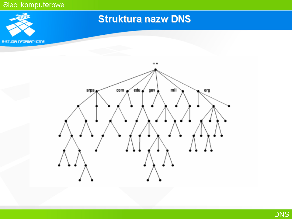 Slajd pokazuje położenie domeny .arpa w przestrzeni nazw DNS.