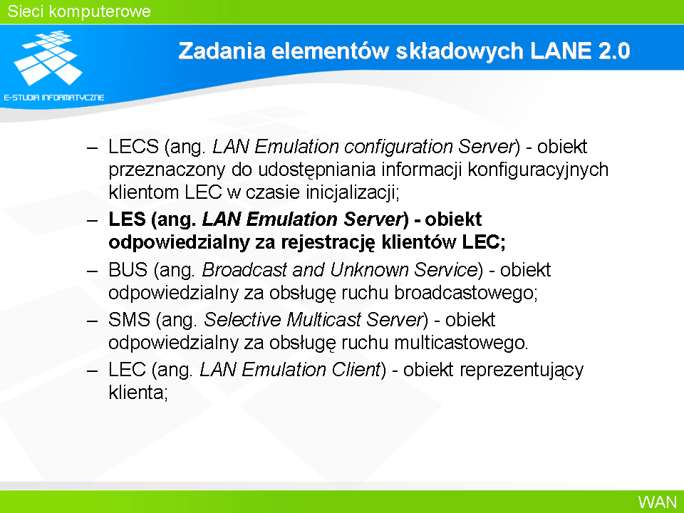 Specyfikacja LANE v.2.0 definiuje 5 podstawowych obiektów odpowiedzialnych za realizację usług w emulowanej sieci LAN. Są to: LEC (ang. LAN Emulation Client) - obiekt reprezentujący klienta; LES (ang. LAN Emulation Server) - obiekt odpowiedzialny za rejestrację klientów LEC; BUS (ang. Broadcast and Unknown Service) - obiekt odpowiedzialny za obsługę ruchu broadcastowego; LECS (ang. LAN Emulation configuration Server) - obiekt przeznaczony do udostępniania informacji konfiguracyjnych klientom LEC w czasie inicjalizacji; SMS (ang. Selective Multicast Server) - obiekt odpowiedzialny za obsługę ruchu multicastowego. Protokół LANE v.2.0 definuje także dwa protokoły: LNNI (ang. LAN Emulation Network Network Interface) - odpowiedzialny za komunikację pomiędzy obiektami LES, BUS, SMS, LECS; LUNI (ang. LAN Emulation User Network Interface) - odpowiedzialny za komunikację pomiędzy LEC a pozostałymi elementami sieci LANE.