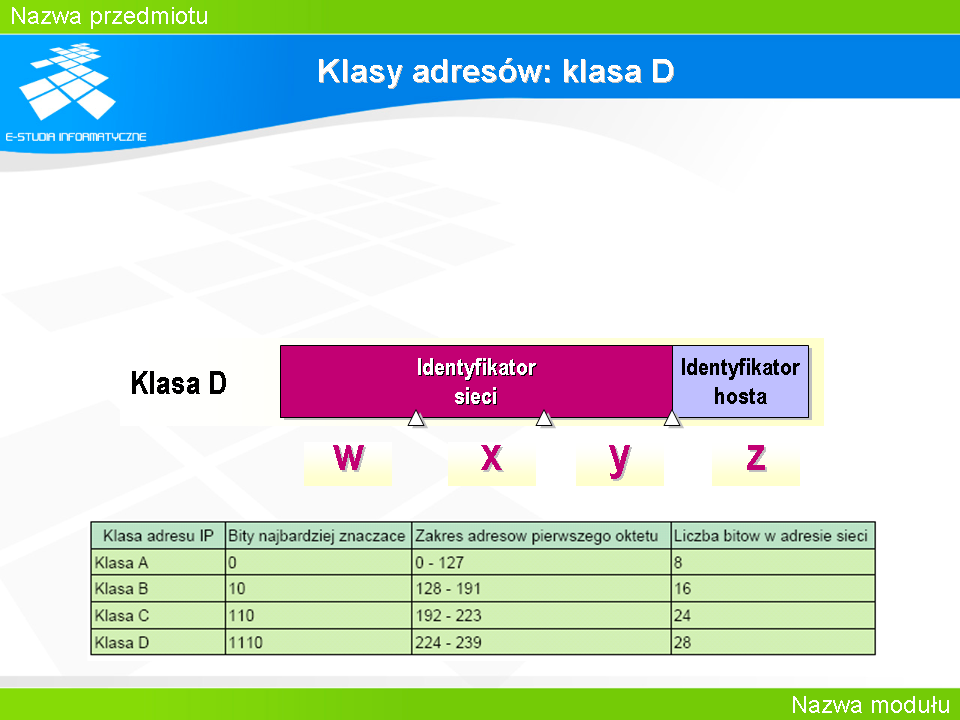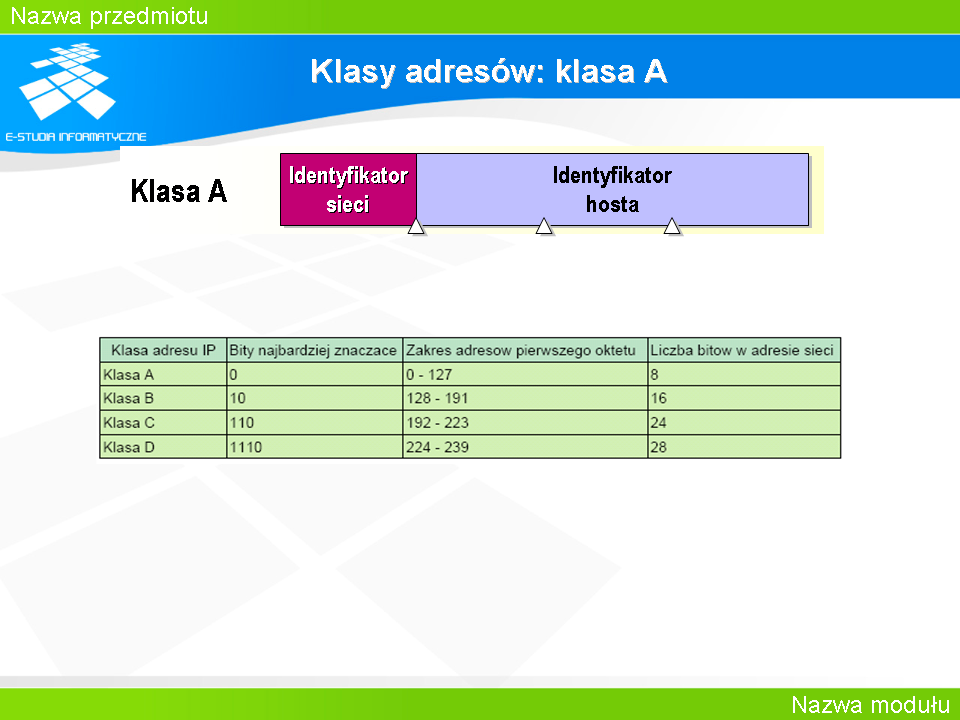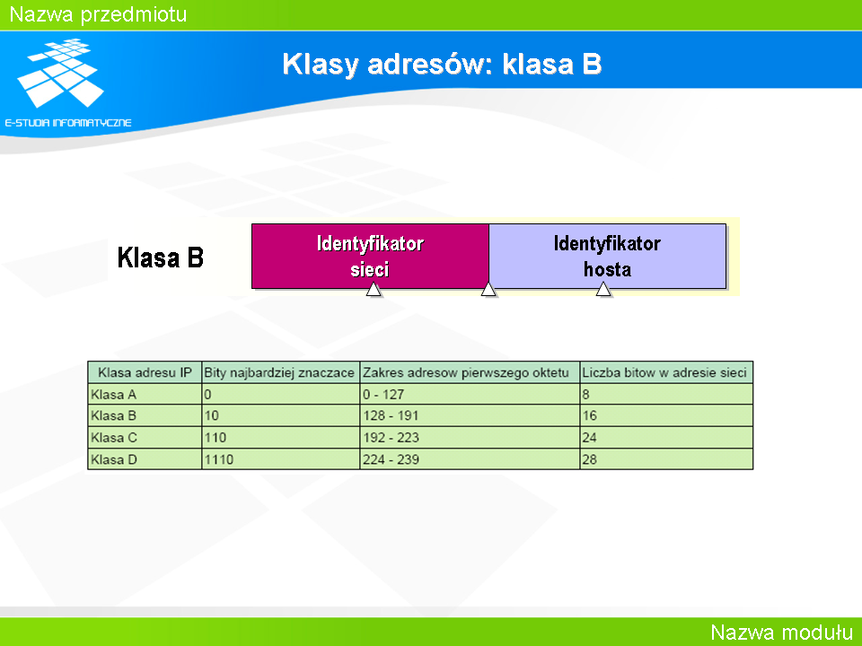 Weźmy dla przykładu adres sieci 192.168.1.0 Standardowo w ramach takiej sieci mamy do dyspozycji 256 adresów, z których można wykorzystać 254 na zaadresowanie poszczególnych interfejsów. Załóżmy, że chcielibyśmy je wykorzystać w taki sposób, że rozdzielić całą pulę adresów na kilka mniejszych i przydzielić te adresy hostom, które znajdują się w 8 pracowniach komputerowych. Trzeba przy tym założyć, że w pracowniach tych będzie nie więcej niż 30 komputerów.