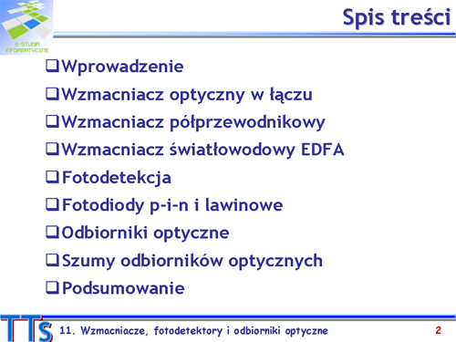 W pierwszej części wykładu opisane zostaną wzmacniacze optyczne, ze szczególnym uwzględnieniem wzmacniaczy światłowodowych, zasady działania i ich parametry.