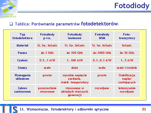 - Fotodetektor - przyrząd do pomiaru sygnału/mocy optycznej, wyróżniamy różne rodzaje półprzewodnikowych fotodetektorów: fotorezystory, fotodiody pn, fotodiody pin, fotodiody MSM, fotodiody lawinowe, fototranzystory.