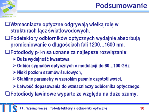 Na zakończenie omówione zostaną konstrukcja i parametry odbiorników optycznych wykorzystujących fotodiody p-i-n. Krótko zostaną opisane właściwości szumowe odbiorników optycznych.